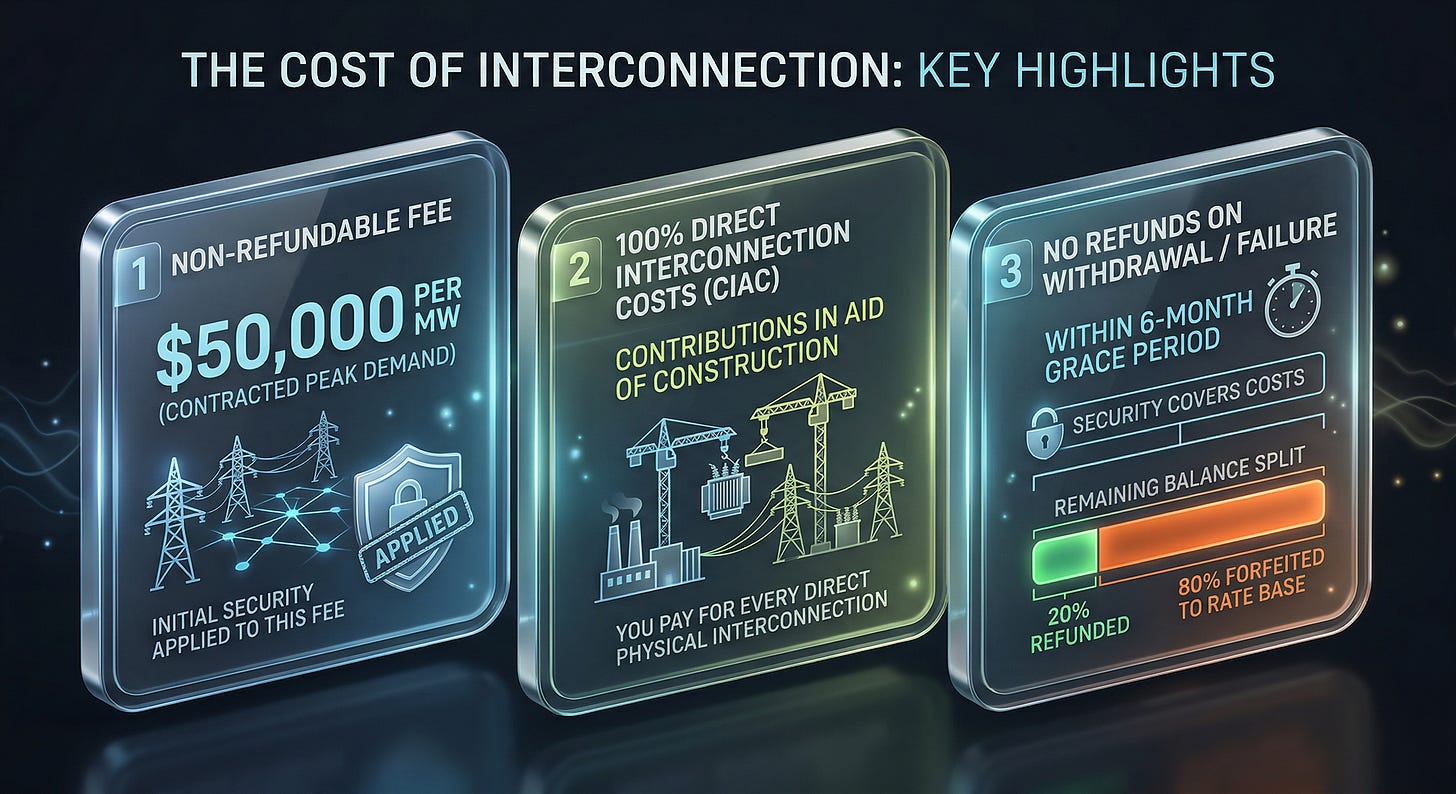 Non-Refundable Interconnection Fee: $50,000 per MW of contracted peak demand. For that 500 MW campus, that’s another $25 million that you will never see again, even if you build the project. Your initial security gets applied to this, but the point stands: this is a sunk cost.