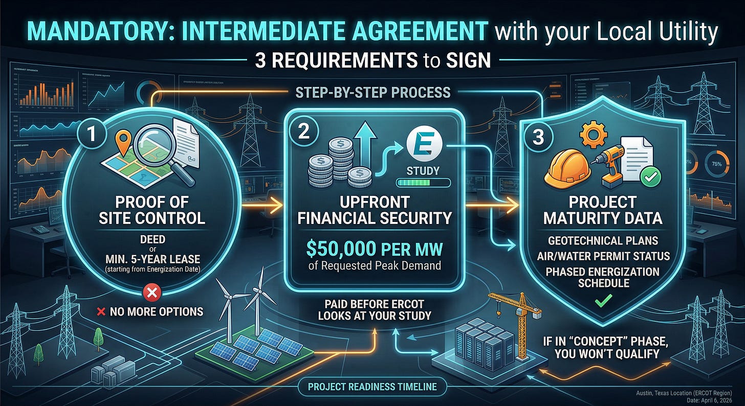 You can no longer just submit a study request to ERCOT. Under the proposed §37.0561, you must first sign an “Intermediate Agreement” with your local utility. To sign it, you need three things: